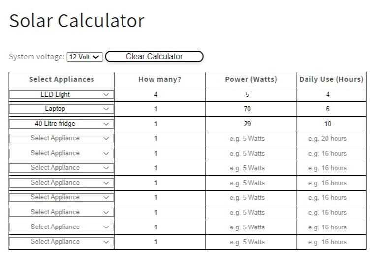 | Type/Select Appliances | How many? | Power (Watts) | Daily Use (Hours) |